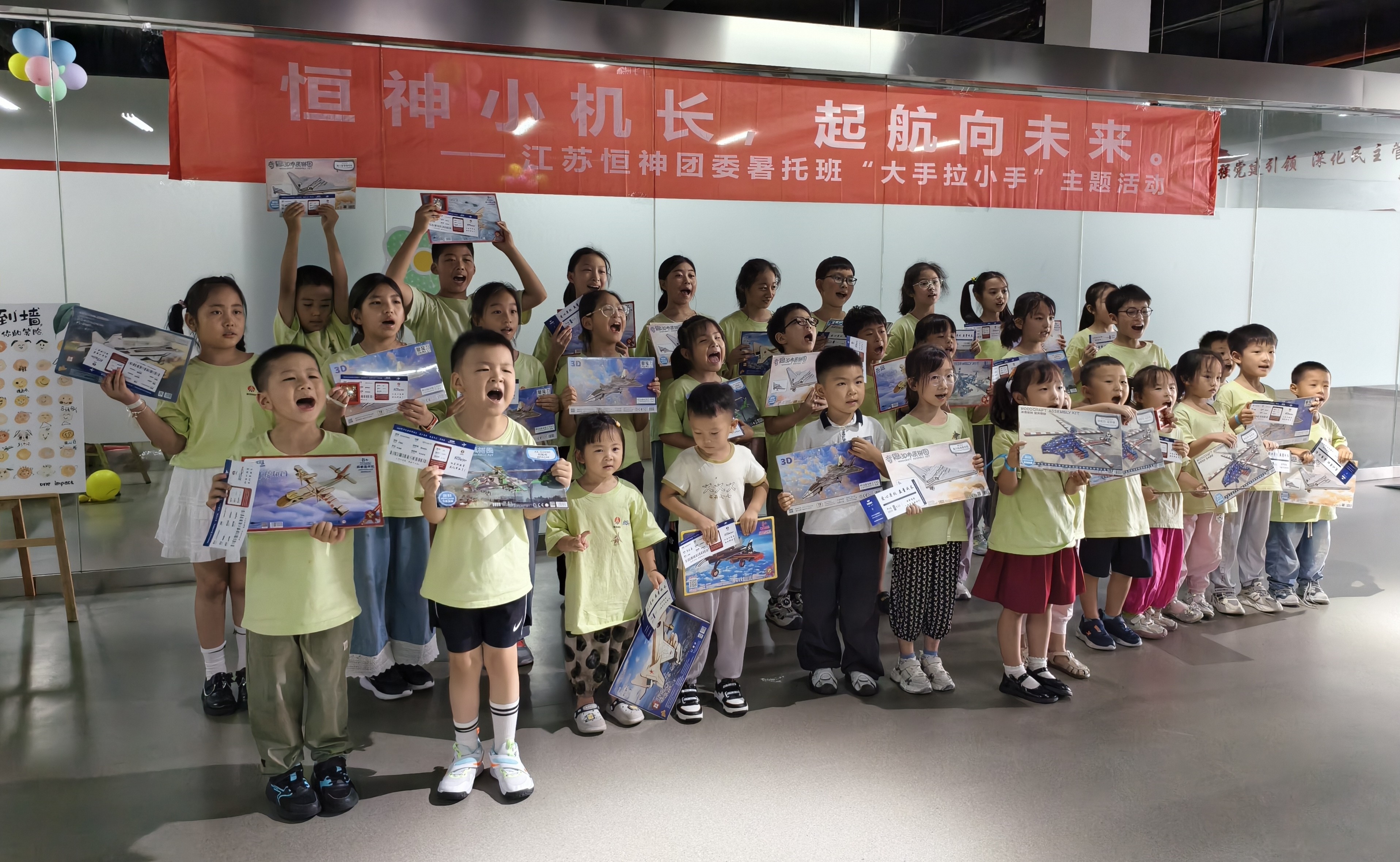 8月12日下午,恒神股份愛心暑托班的活動場地變身歡樂航空港,約50名職工子女化身 “恒神小機長”,在團委青年們的帶領(lǐng)和陪伴下,開啟了一場充滿歡笑與成長的航空主題奇妙之旅。這場以 “恒神小機長?起航向未來” 為主題的趣味游戲活動,讓孩子們在輕松愉快的游戲中收獲了知識、初步建立了團隊互助協(xié)作的觀念。開場破冰:舞蹈牽情誼,小隊齊集結(jié)隨著歡快的音樂旋律響起,活動正式拉開帷幕。5名團委青年與孩子們手拉手圍成圈,跟著節(jié)奏蹦跳旋轉(zhuǎn),原本有些靦腆的小朋友們很快被活潑的氛圍感染,大廳里瞬間充滿了銀鈴般的笑聲。這場破冰舞蹈就像一根無形的線,迅速拉近了青年志愿者與孩子們的距離。在簡要的自我介紹后,大家通過抽取彩色手環(huán),分成了紅、黃、藍、綠、白五支小隊,展開了一場場趣味比拼。趣味闖關(guān):航空主題游戲里的知識與協(xié)作折紙飛機環(huán)節(jié)迅速點燃了孩子們的激情。大家拿著 A4 紙,跟著領(lǐng)隊老師學(xué)習(xí)折疊技巧,有的還別出心裁地畫上笑臉和花紋。“三、二、一,起飛!” 當(dāng)數(shù)十架紙飛機穿過 “書架圓環(huán)” 時,大廳里爆發(fā)出陣陣歡呼。“我是拼圖小能手” 環(huán)節(jié)堪稱對 “速度與協(xié)作” 的考驗。當(dāng)飛機拼圖被分發(fā)到各隊時,孩子們立刻圍坐在一起,七手八腳地開始拼接。“這塊應(yīng)該在這里!”“不對,看機翼的形狀!” 團委志愿者們在旁耐心引導(dǎo),既不包辦代替,又及時給迷茫的小隊員們支招。最終,各支隊伍都順利完成了拼圖任務(wù)。“飛機連連看” 游戲成了記憶力大比拼。孩子們盯著倒扣的紙牌,時而蹙眉思考,時而拍手歡呼,團委志愿者們則在一旁計時鼓勁、還要熱心的小朋友不時用掌聲鼓勵加油。最終,所有孩子都贏得了木制飛機模型拼圖,獲勝隊伍的小朋友還優(yōu)先挑選了心儀的款式。溫情收尾:徽章與機票見證成長,愛與理念扎根心間活動尾聲,每位小飛行員都領(lǐng)到了閃亮的 “恒神小機長” 徽章,驕傲地別在胸前。當(dāng)印有每個孩子名字的 “結(jié)業(yè)機票” 被鄭重頒發(fā)時,不少小朋友舉著機票和模型向志愿者們開心地道謝。本次活動旨在讓職工子女在歡樂中感受航空精神,同時通過青年志愿者的陪伴,傳遞企業(yè)對員工家庭的關(guān)懷。這場持續(xù)兩小時的活動,像一根堅韌的 “情感碳纖維”,將企業(yè)、家庭與孩子緊緊相連。恒神團委的青年們用熱情與愛心,為孩子們的暑假添上了一抹明亮的色彩,也讓 “愛與未來一起飛” 的溫暖理念,深深扎根在每個人心中。